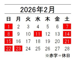 当社、2026年2月の営業日カレンダーは、以下のとおりとなっております。 宜しくお願い致します。